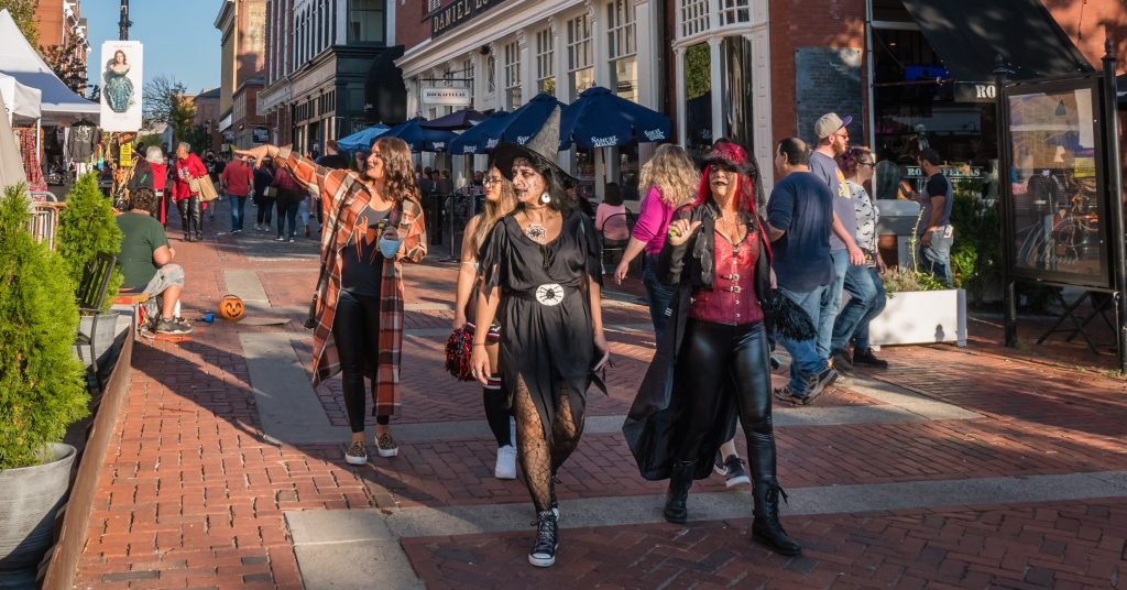 Nearly half a million people make the trek to Salem to celebrate Halloween each October. Haunted Happenings, a highlight of these spooky celebrations, features a parade, a street fair, film nights, ghost tours, costume balls, haunted houses, and live music.
